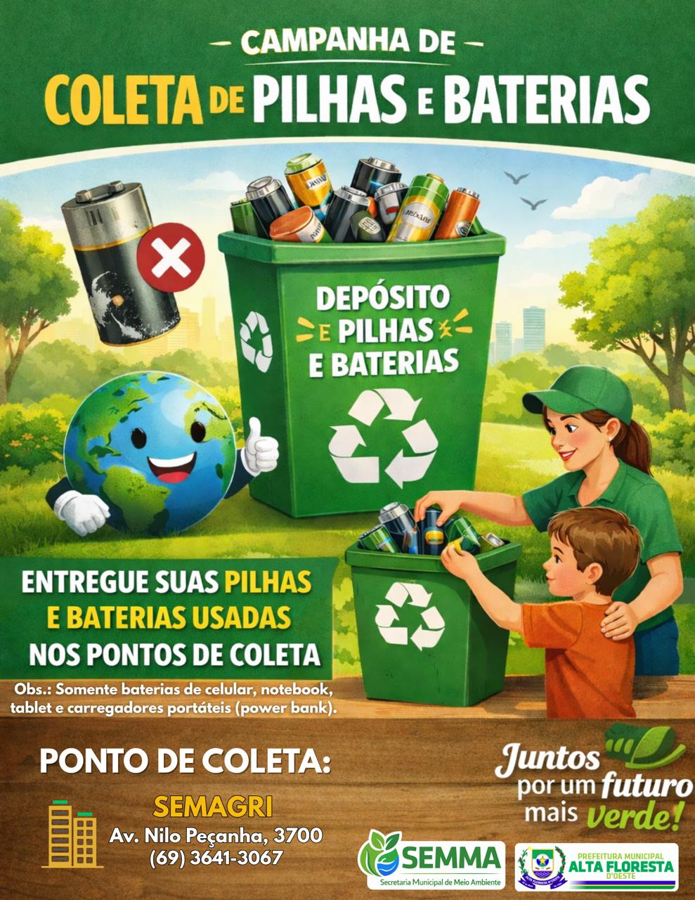 A Prefeitura Municipal, por meio da Secretaria Municipal de Meio Ambiente (SEMMA), anunciou a abertura de uma campanha voltada ao descarte correto de pilhas e baterias. A iniciativa busca mitigar os impactos ambientais e os riscos à saúde pública causados pelo descarte inadequado desses materiais.